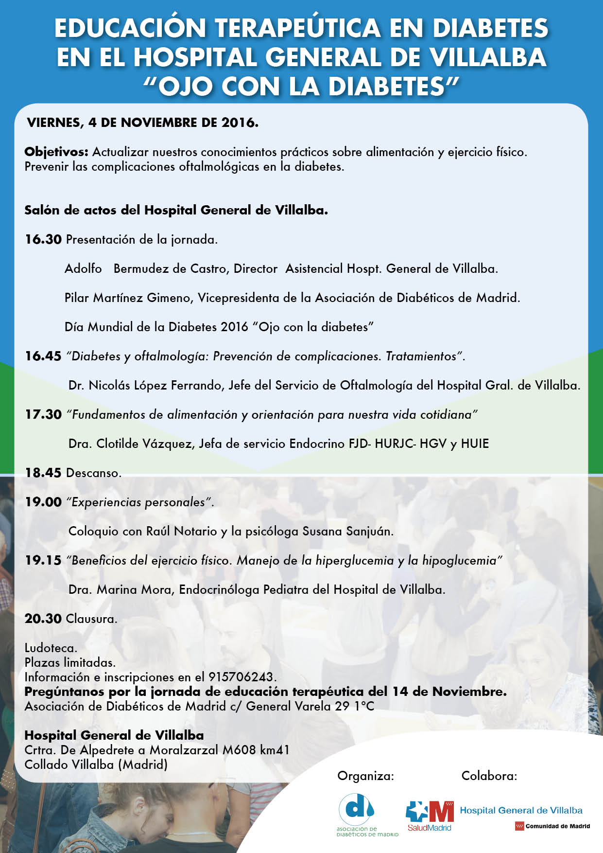 El próximo 4 de noviembre de 2016 de 16.30 a 20.30h se va a celebrar en el Salón de actos del Hospital General de Villalba, una Jornada de información Diabetológica.