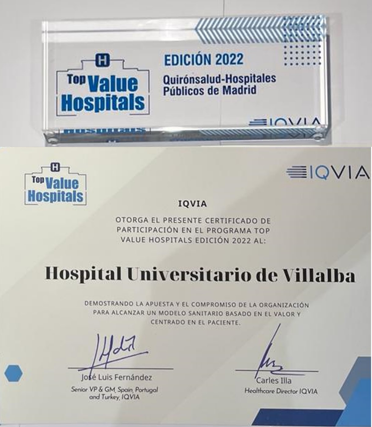 El Hospital Universitario General de Villalba, integrado en la red pública madrileña, ha sido galardonado, por segundo año consecutivo, con uno de los Premios Top Value concedidos por la compañía consultora de mercados IQVIA en reconocimiento a su excelencia y apuesta por una atención basada en el valor, junto a los hospitales universitarios Fundación Jiménez Díaz (Madrid), Rey Juan Carlos (Móstoles) e Infanta Elena (Valdemoro).